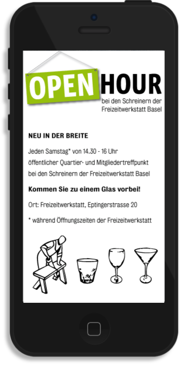 Unser Verein sucht Hilfe für die gelegentliche ehrenamtliche Betreuung von Holz-Amateuren in der komplett eingerichteten öffentlichen Holzwerkstatt Basel-Breite. Bitte um Meldung an den Vorstand des Vereins Neue Freizeitwerkstatt Basel, Luc Dolder Email: luc.dolder@holzwerken.ch Wir freuen uns auf Dich!